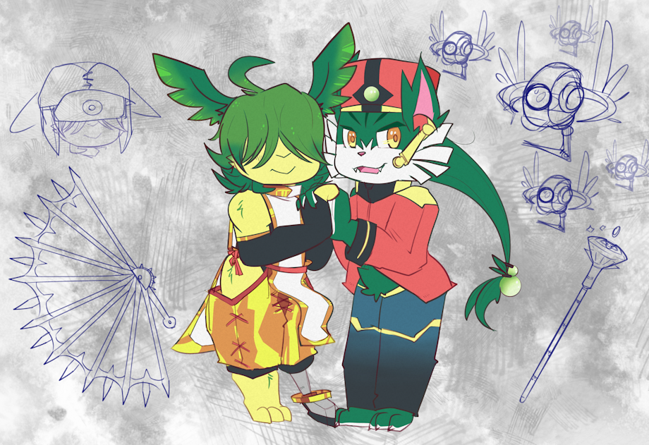 some yordle OCs of mine. Still unsure of the names. I'm feeling Rue and Tucket. Left one's a support ninja that uses Wind and Plant styles. He uses a combination of the two for heals, buffs, and poisons. Right one's a student of Piltover U. When not studying or in band practice he fights using drones he made himself.