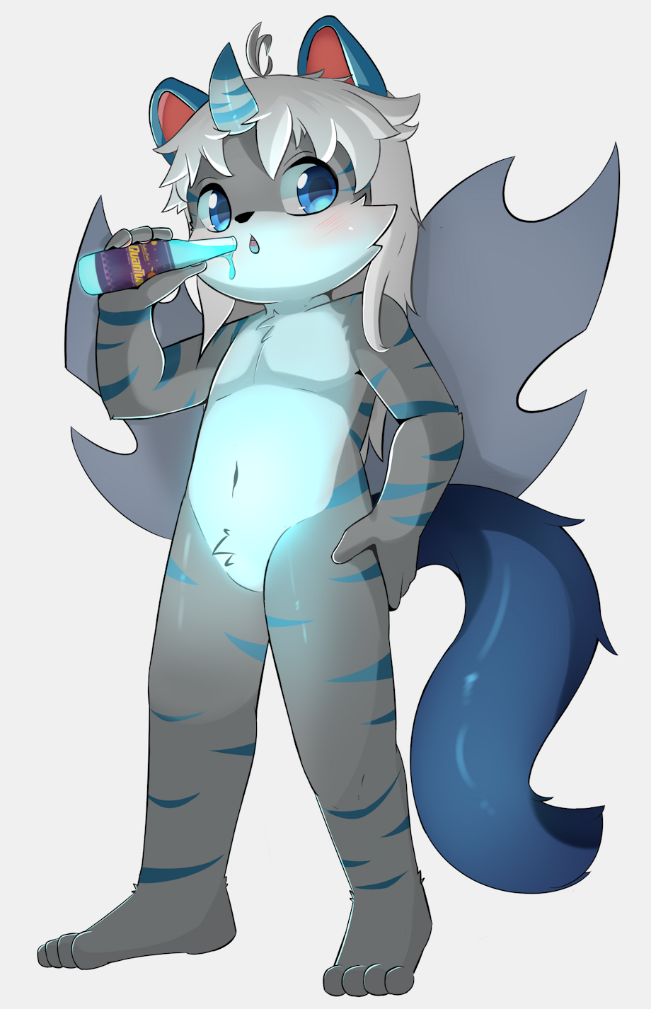 What? Did you really think Lokil´s favorite drink is something normal like milk or soda. Of course he would pick something that makes his body glow like a firefly. Besides, all the sugar is great fuel for his chaos powers. I wonder if this makes his cum glow too. "HANA! We need to test something out!"