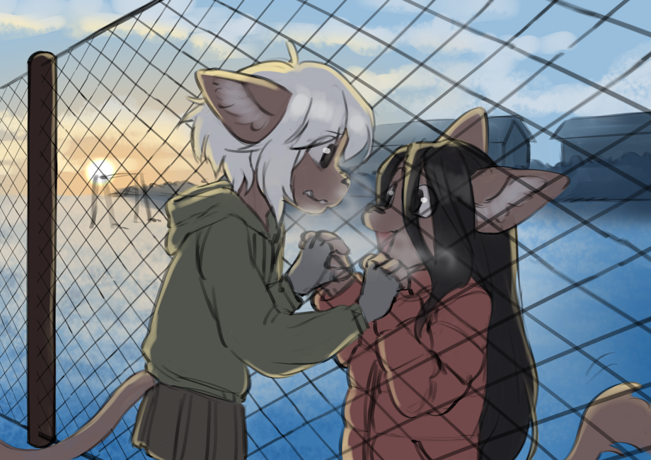 A cold winter filled the city as a bunch of people rushed into their business to get back home. The orphanage was a bit quiet around this time, thanks to the cold. A few children is still allowed out, into the playground where we find Orphan 2 sitting and seeing out into the open through the holes of the fence. Her big black eyes took in the scenery as a familiar figure caught her eye. She quickly stands to see her big sister The Orphan, appearing out of the bushes and running towards her. Orphan 2 shouted, "SIS!" She started bouncing up and down excited as the older Orphan grabs the fence. "I'm here! I'm here! Estás bien?(Are you okay?)" Spoke the older sibling. "SI (yes)" the little one responded proudly while wagging her tail gently. "I'm so sorry I took so long. So many things happened and I lost count of the days and-" the oldest spoke but was quickly stopped by the warmth of her youngest sibling's hands, holding onto hers. "Is okay, you're here now! So...so is it time?!" The young one spoke. The oldest sibling looked into her young sister's eyes as they are full of hope and excitement. "I...can't adopt you right now... I still don't have enough..." The oldest almost shed a tear. "Is okay... I can still wait! They got mad and said I won't be adopted yet because of what i did hehe." The young one, despite the bad news, kept positive and reassured her older sister. "Que hiciste?(What did you do?)" The Orphan asked. "I got naked and walked in the room where they wanted to see me, hehe." They both giggled but their laughter was interrupted by the little one's stomach. It growls softly as the young one sighs. "I'm hungry...they got mad, they said no food for me." The oldest growled in anger but quickly controlled herself and reach into her pocket, revealing an big apple fritter. The young girl's eyes locked onto it and begins to drool. "Oooh luckyyy, that looks goooood." She spoke. "Toma(here). It's yours, hide it in your jacket." The older one spoke, as the youngest wipe her drool away and takes the bread before getting a big bite. "Gracias!" The little orphan spoke as she sniffles gently. "I've got to go, I see a line forming in the building entrance, I think you will have to go!" The oldest spoke. They both look back at the building that they don't consider as home, then they look back at each other. "You will come back right? I will behave here when you come back." The young one spoke. Determine the Oldest Orphan nods and reaches to kiss her young sister in the forehead. "I promise! I will get you out!" The young orphan's lit up and her smile has formed again."HEY GIRL! RECESS IS OVER! GET OVER HERE NOW!" a staff member of the orphanage yells and starts walking towards her. "G-Go! I need to go!" The young one spoke and turns around to the staff. While the oldest makes a run for it and hides into the bushes, she peaks over and see that her sister is being escorted back to the building. She sees the staff member smacks her sisters head for not disobeying their orders, which only makes the Orphan more determined to get her little sister out. "I promise, I will get you out of there." She spoke. The city got colder that day.