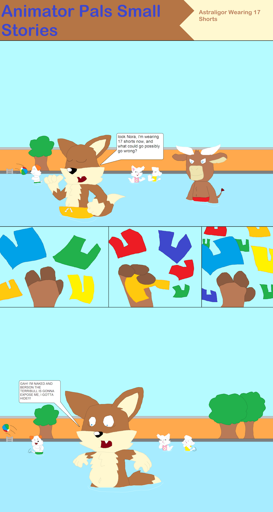 Araguania was hitting a huge heat wave, the temperatures we're hitting 41 degrees celsius, the crime waves we're high but the heat wave was to the limits, astraligor's class we're started to overheat if they don't get refereshed enough, then the principal said that astraligor's class was going to the public pool club near a few streets, so they packed up their swimshorts and speedos and any other bath suits and went to the pools. after arriving at the public pool club, astraligor was ready enough to outsmart his bullies, then he said to nora "look nora, i'm wearing 17 shorts, and don't worry i won't lost them, what could possibly go wrong?", then Berson the bull has rushed to astraligor and started to take off all of his 17 swimshorts leaving the fox boy bare naked "GAH I'M NAKED AND EVEN WORSE THAN THAT, BERSON WILL EXPOSE ME, I GOTTA HIDE VERY QUICK!!" paniced astraligor, then he started to hide his bare nude body down the water, nora saw a brown foxy tail on the water and gave astraligor a towel so he won't be very humiliated, then nora and her twin brother we're looking for berson to give back his swimshorts but a bush grabs astraligor's towel leaving him in the nude again, he realized his towel wasn't there and yelled "OH MAI GOSHI, MY TOWEL IS MISSING", "calm down big bro, i'll get you out of this situation befo-", "look guys, ASTRALIGOR IS NAKED, LET'S HUMILIATE HIM! HAHAHA!!!" then the croud started to laugh at the fox boy's ashamed nude body, before heading back to the bus Berson punches astraligor's arm on ruining their pool day and Maria Gataíde filmed astraligor's embarasing situation and she will upload on the school's blog on a archive called Astraligor's Ashamed Adventures Compilation and upload it on AventurionTube. after arriving home, Anthonitecus saw the video and the blue wolf was laughing a lot but it made astraligor cry into his room, alycia told his husband to help him surpass his shame, anton enters his room and he told him that when he was adventuring in ancient rome he forgot his adventurer cloth on the washing room leaving the blue wolf being naked in public and even worse than that, the emperor saw the blue wolf's nude body and registered it on the funniest moments in rome, astraligor laughed a little but anton was also in the laughter with his son, the duo laughed a lot about their embarasing moments envolving water, public pools and shower rooms, anton and astraligor then decided to go on another adventure just to make the brown fox feel better.