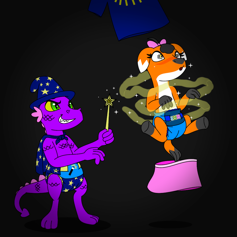Even after escaping the Labyrinth, this Baby Wizard continues to roam the cellar of the daycare. Every so often, Leyenda goes down there to look for something, only to have a sudden spell casted on her by this diapered troublemaker. This time she found herself regressing to a foal, though she still retains her adult mind. Doesn't stop this hatchling from forcing her to act like a foal.