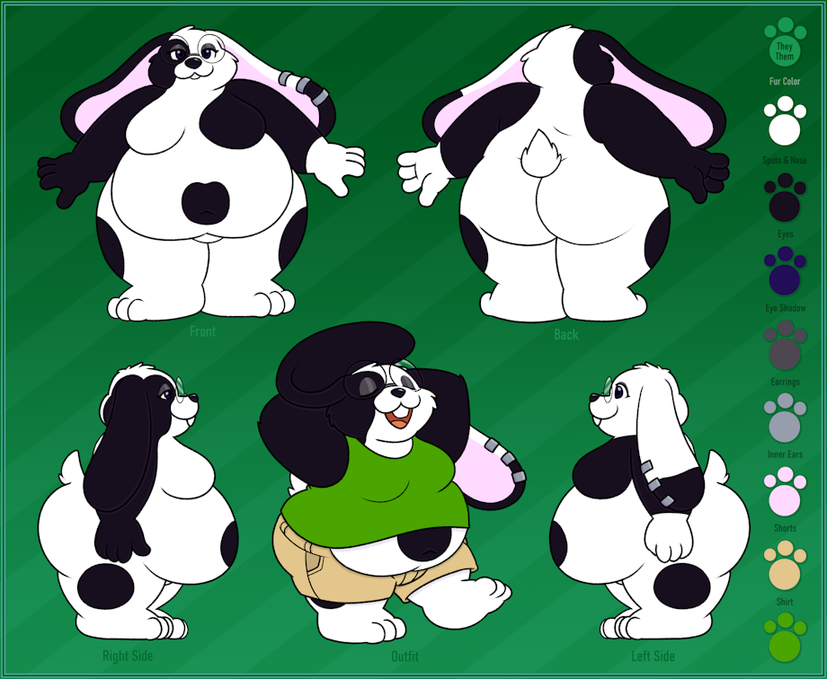Their main form over the years has been a bear, with a bunch of other cool species and OCs too! This one seems like their next new main fursona. :3 Bunnies are big and chill, and this one's all tubby and white covered in black spots - but with some cool accents like their triple earrings and eyeshadow - but still have some things their bear had, aside from the size, the clothes and glasses too! :3 A fun full form and a bunch of angles so you can get to know all their different spots and positions. Woop~! What a big beautiful bunny. And haha, finished right when Year of the Rabbit starts I suppose~!