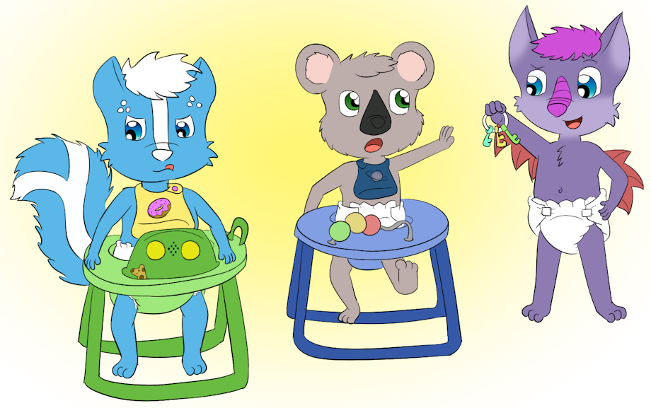Here's a patreon reward for Kola on furaffinity. It was a bit based on the last world cup, where Gussy was cheering for Brazil and Kola for England, and the one that got eliminated first would be the baby of this picture. Well, both were eliminated in the same phase, so both lost it, and now [iconname]NazTheBatt[/iconname] is there keeping an eye on the babies and their waddlers.