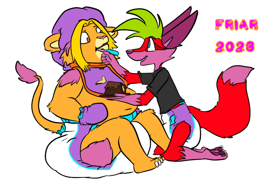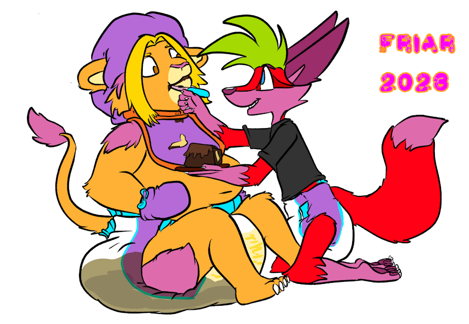 Illustration of Friar being fed birthday cake by Berry in the treehouse while he wears a very messy diaper, bib, bonnet, and mittens.