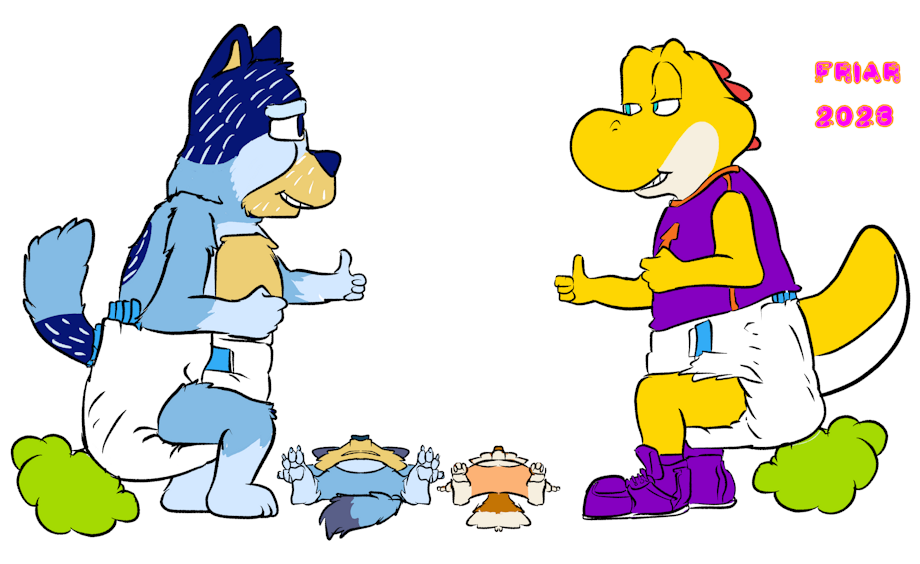 Illustration of Bandit and Showtime tooting in heir diapers, knocking out Bingo and Bluey from the smell.