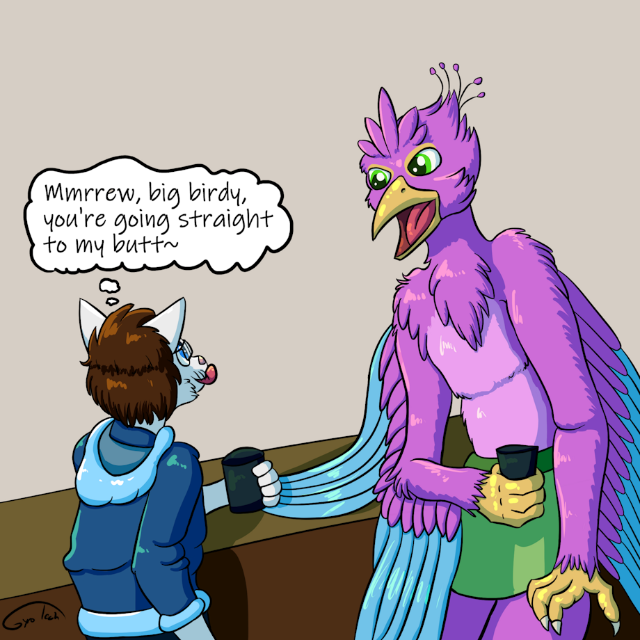 “Very, I won’t have any trouble with you at all,” Tybalt lied. He just hoped starving himself leading up tonight would be enough to finish the huge meal before him. “Besides, cats and birds are kind of a classic combination, aren’t they?” Tybalt replied, his heart racing with excitement. He couldn’t believe his ears; Gyro was into it! He’d finally experience what it was like to be a predator, and his prey wouldn’t even put up a fight. The bartender placed their drinks in front of them and they each took their own. “To being delicious,” Tybalt winked as he playfully clinked his glass against Gyro’s.
