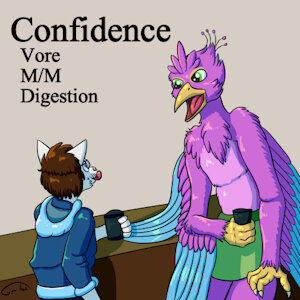 “AAaaa–HULLPP!” Gyro swung his wide open beak down over the cat’s head, cutting off his final mew of protest. His hands slid down from Tybalt’s shoulders to his upper arms, pinning them to the cat’s sides as he squirmed against the bed and kicked his legs. “G-Gyro! Mmph! I’m supposed to be the pred!” The cat yelled, but every time he opened his mouth the walls of the bird’s throat clenched around his muzzle, holding it shut so all he could do was let out muffled mewls. “Mmphhh!”