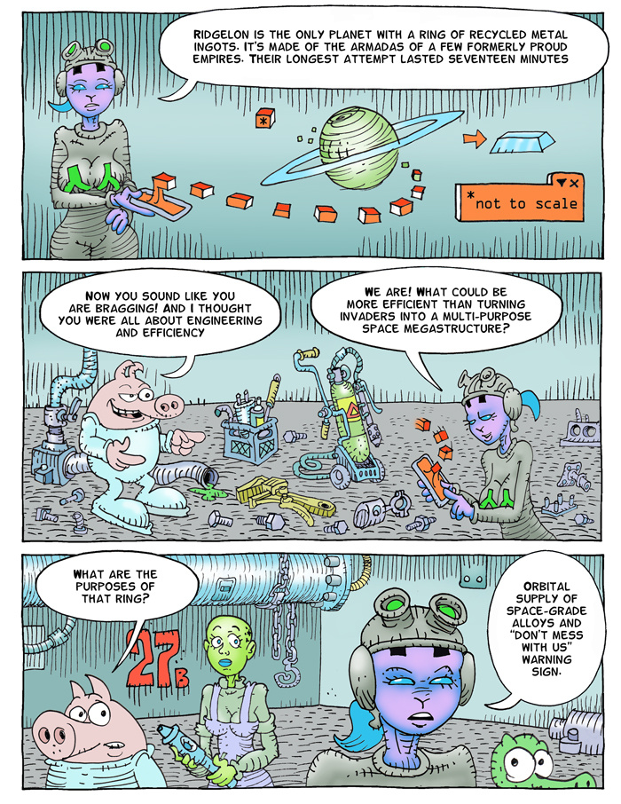 After a long hiatus struggling with art block and some other difficulties, I have managed to pull out another episode of my comic. This time with a little more worldbuilding background on the engineering-oriented Ridgelonian species.