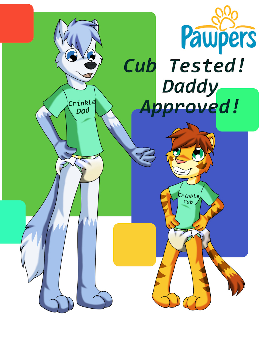 Well it was a lot like what he expected except for a few things. He never realized how warm the studio lights could be and was rather thankful to have light fur that wouldn't hold onto as much heat. He also found out that staff changers were not just for the cubs. The diapers had to be applied perfectly so they looked their best in the ads. Jakey only blushed a bit as the staff changer got him into his diaper which upon coming out he noticed matched Lig's which of course got the lil Liger cub giggling about how their poofy bottoms matched. Next did indeed come all kinds of posing for the camera. Some with them individually and some with the two together doing this or that. Jakey had found himself having fun with all of it though and Lig seemed to be enjoying it all with his daddy. Finally the last photo was called for and the photographer told Lig to "Do your thing." Lig nodded and proceeded to squat a moment and pack his Pawpers as the photographer snapped a number of picture of that. Jake sighed and shook his head as they took a picture or two of that. The last photo of the day was Jake offering a grinning proud Lig his hand and saying they should go get changed. Two weeks later they received their usual promo materials which included copies of all the photos from the shoot as well as copies of the ads. Jake couldn't help laugh reading the tag line for the one. "Cub Tested! Daddy Approved." And Daddy did indeed approve, both of the diapers and his lil Pawpers packing cub. He was Just like Daddy.