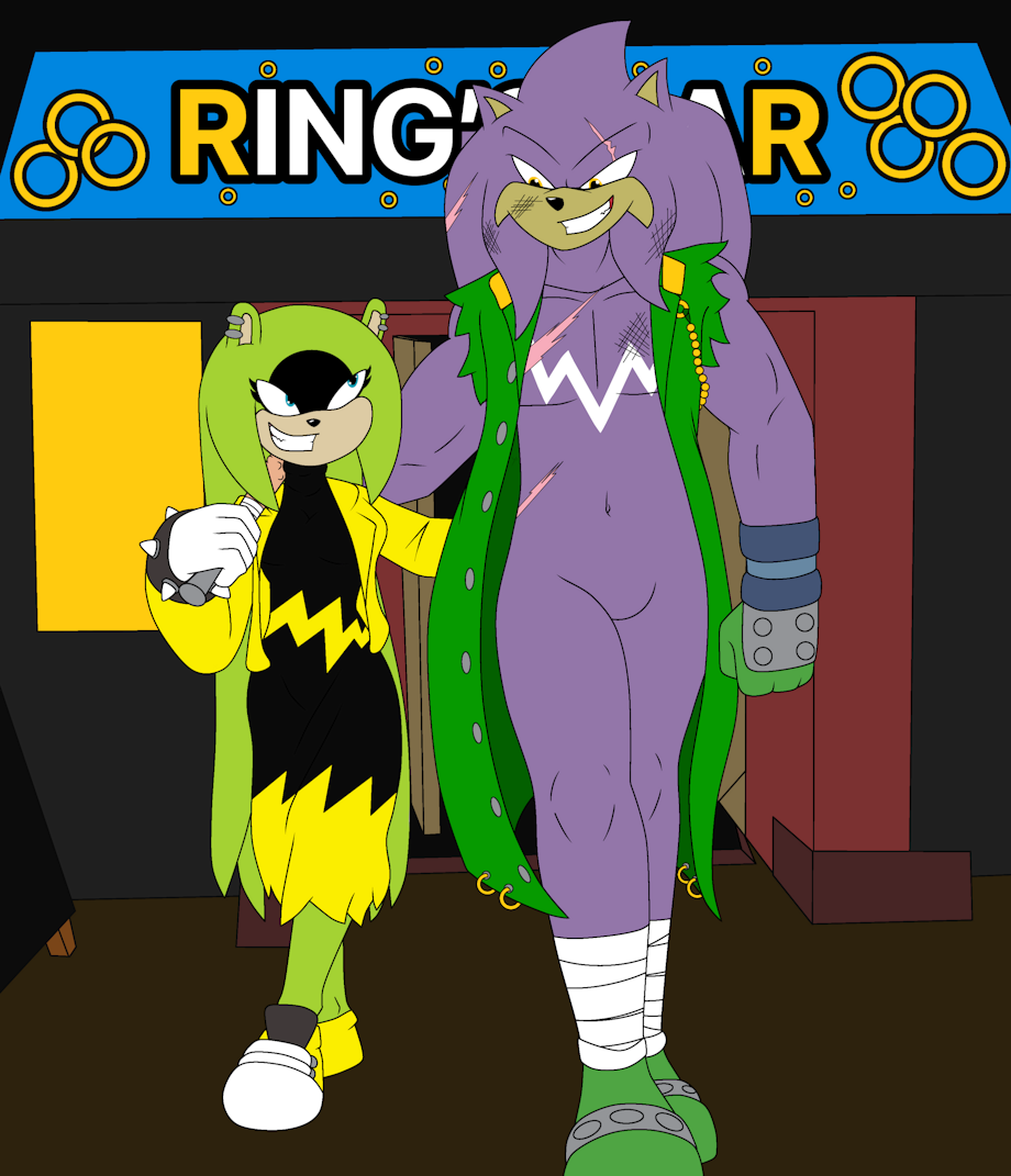 They have a date in a bar and cause a Bar Fight for funsies. Surge loves to use her Kanabo, Electric Punk. Thrash scarred fighting the Echidna and the Lion. Both are mature but they still have their own side with the Havok Hellions.