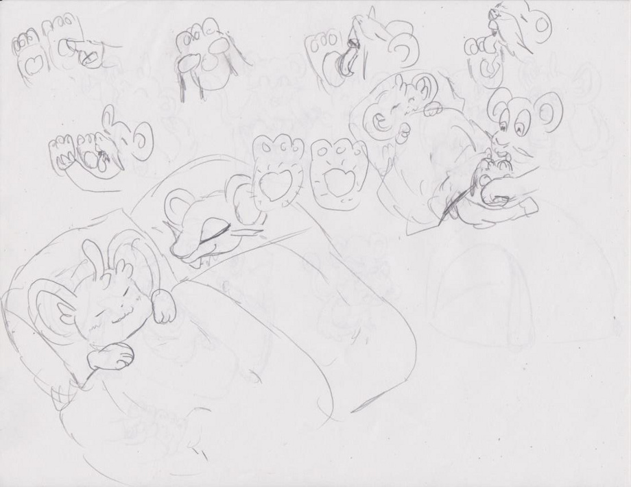 2) Momentos después, Minccino se estaba cansando, así que rattata la llevó a la tienda para que pudiera dormir. Cuando minccino comenzó a dormir bajo las sábanas, rattata levantó la manta cerca de sus pies para mostrárselos a rattata. Bajó y comenzó a acariciar sus patas. Quiero 4 escenas más de Rattata acariciando las patas de minccino.