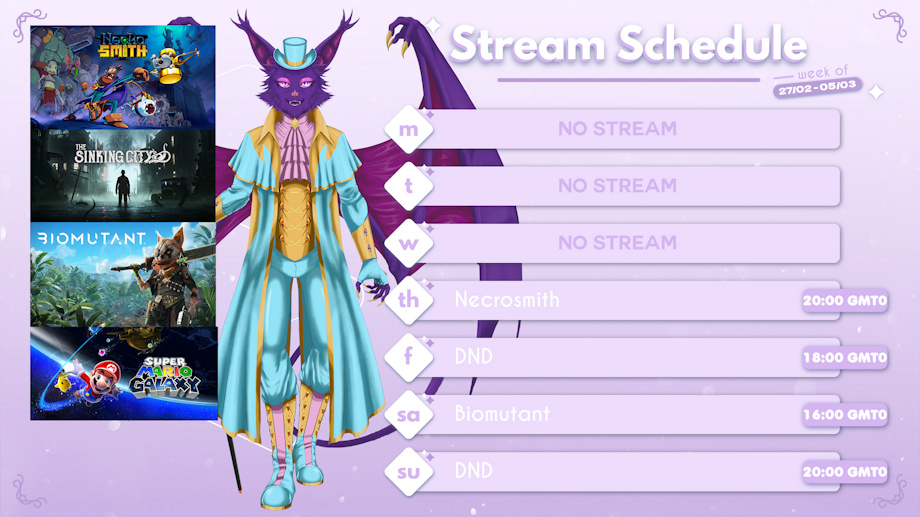 Here's my stream schedule for the week. Taking a suggestion from Auwufy with Beacon Pines, looting an old manor in The Sinking City, getting a jetski in Biomutant & searching through Rosalina's Bedroom in Super Mario Galaxy.