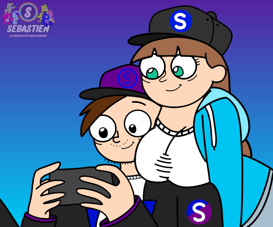 Here is a drawing of Sarah and Mr.S listening to compilations of Bigjigglypanda's laughs and rages and Gartic Phone's French and English videos on YouTube.
