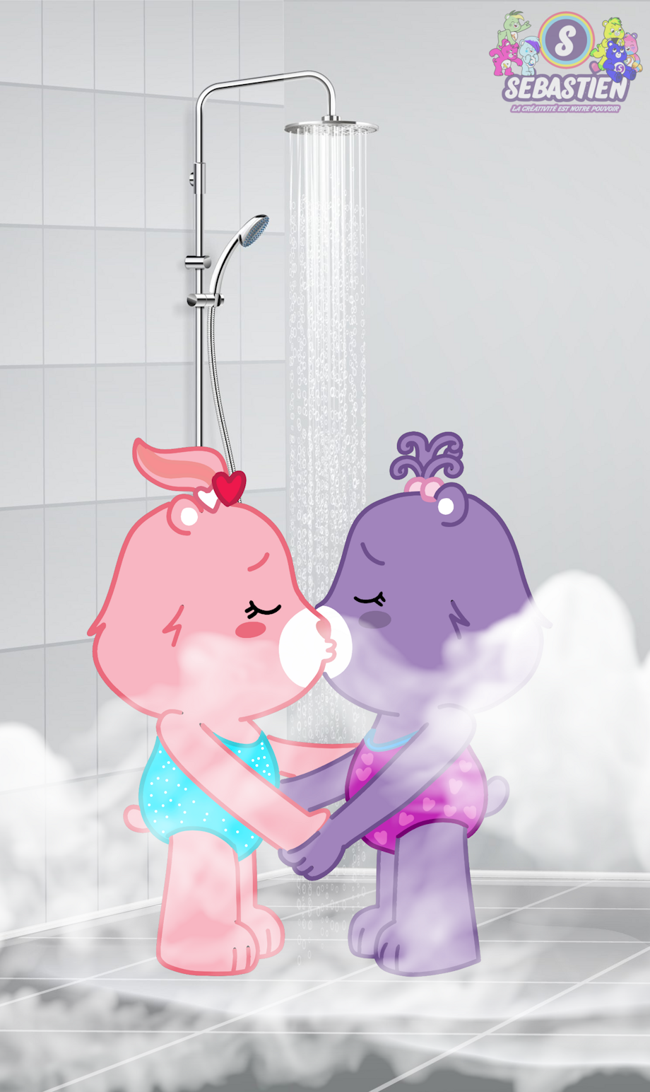. He requested me to do a drawing of Love-A-Lot and Share Bear from Adventure in Care-a-Lot kissing under the shower of rinse romance. So there is it.