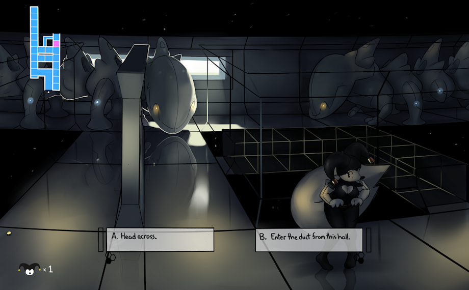 'Your right bell rang when you considered entering the duct, so you decide to continue down the hall instead. You quickly check the door and find it's locked.