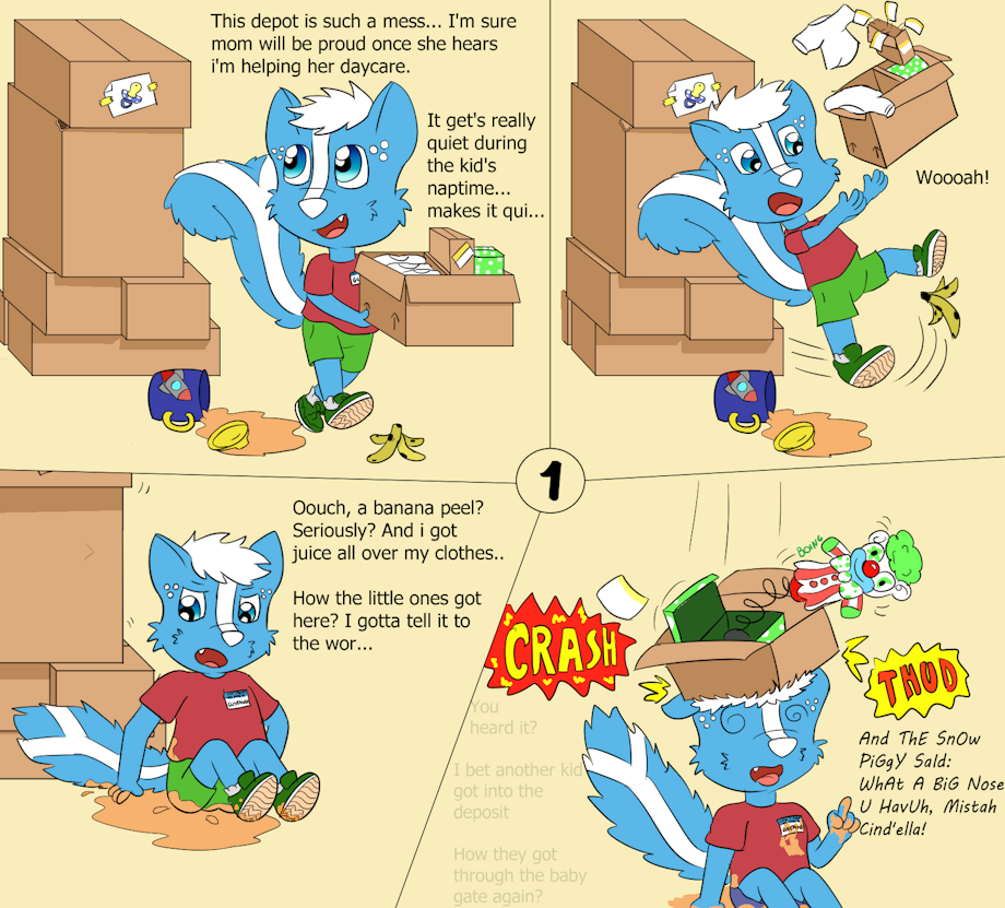 here's a silly idea i've got from a few sketches, based in an idea i had some time ago. Seems Gus is helping in a daycare, and during the kid's naptime, he went to sort the boxes from the supply room, but deals with the leftovers from a kid that ran after snacktime there. and it starts a chain of events that leads him to get knocked off by one f these boxes.