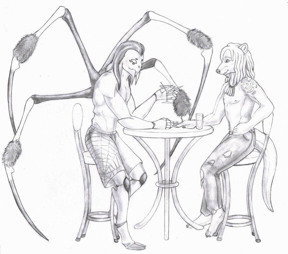 Sunkra spider and Sunkra the otter. having a friendly drink