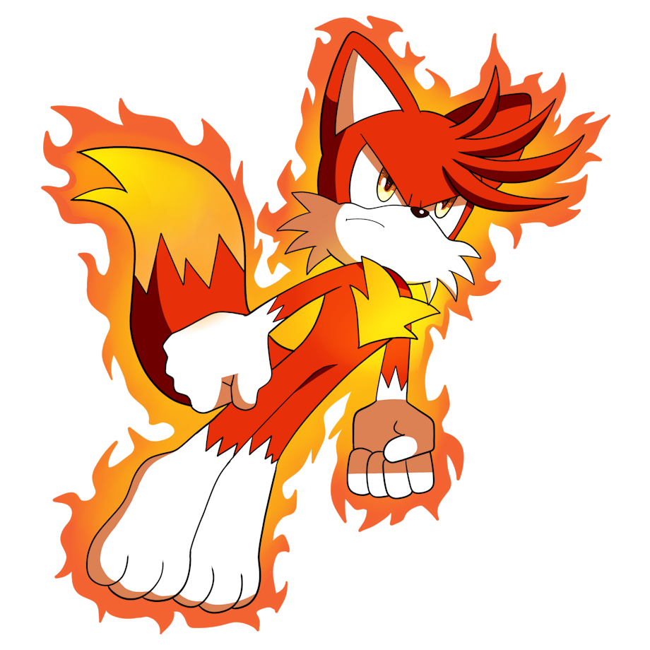 Kingston in his fire super form after losing his necklace, the white fur on his chest and tail glows while the power is in use.