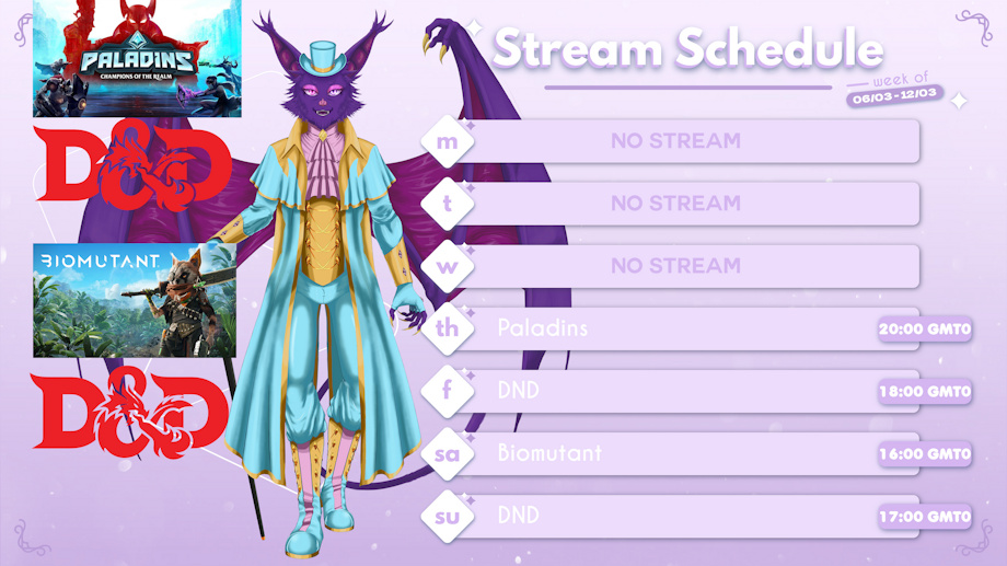 Here's my stream schedule for the week. Building a horde in Necrosmith, the some DND, electrifying another World Ender in Biomutant & then even more DND.