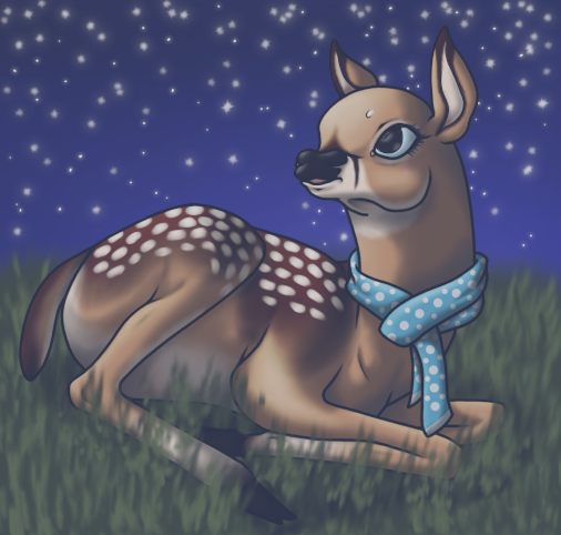 I'm so excited about how this picture turned out! I was able to edit the sketch to improve the lines some (mostly on the face). But I'm mostly excited by the night sky! I may have gone a little crazy adding stars, oops~ But I also love how soft the fawn came out. The soft browns just make me squeal. <3