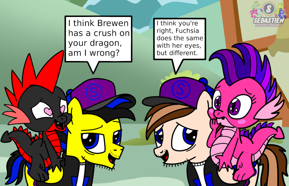 Brewen (PonySeb 2.0's assistant dragon) immediately falls in love with Fuchsia (who is on Seb the Pony's back) just because of Fuchsia's round belly.
