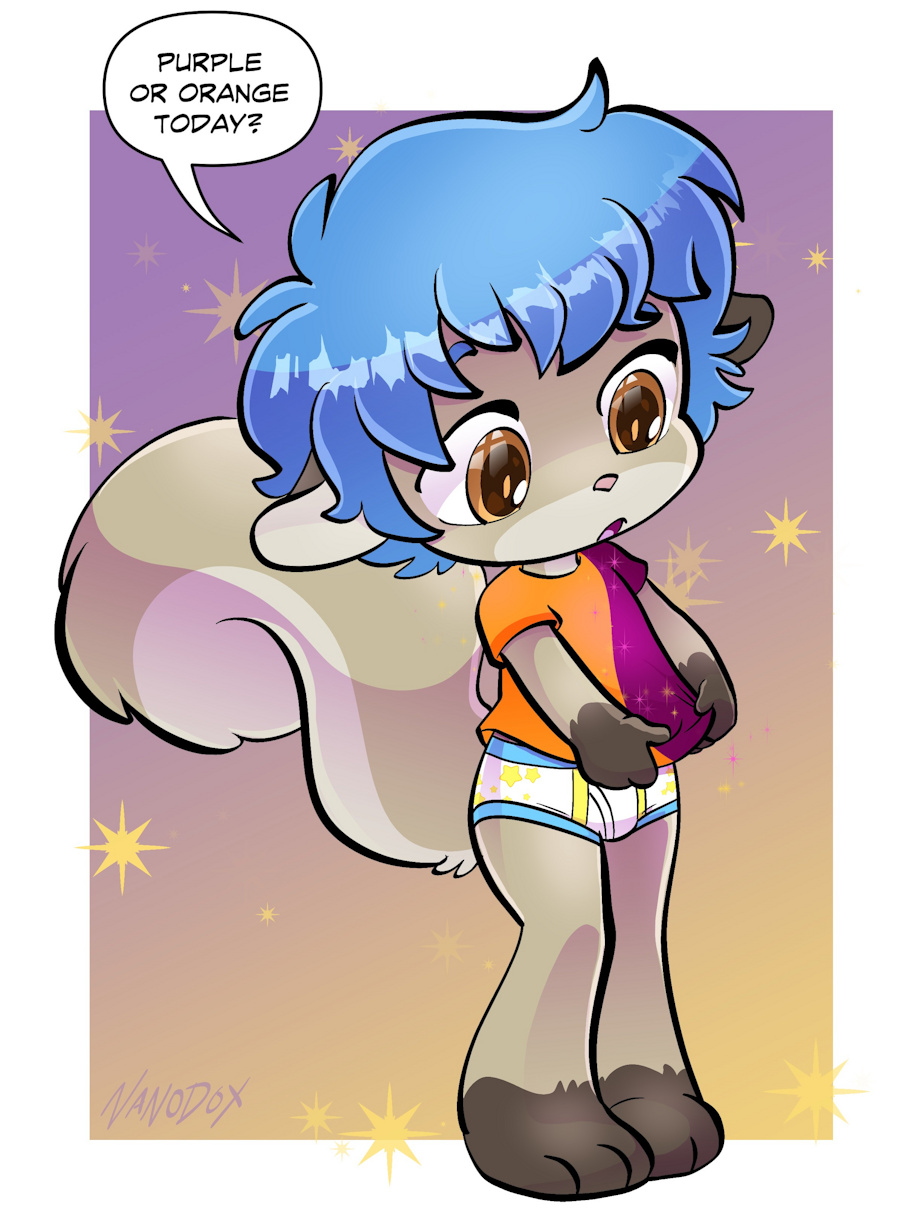 Why not both? Orange top with purple undies. :3