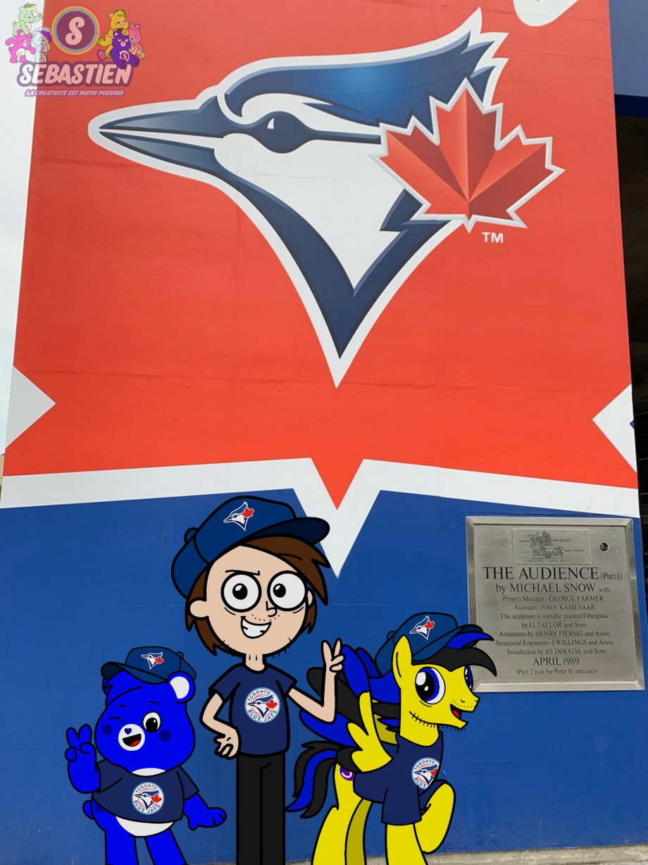 Mr.S, PonySeb 2.0 and Creative Bear being a Toronto Blue Jays fan in front of the gigantic Toronto Blue Jays logo.