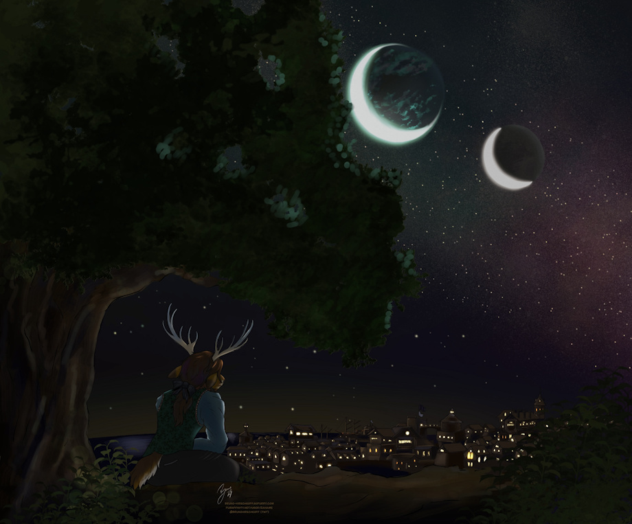 This is the first time I've attempted a landscape picture; that's Stillwater Cove in the distance, and overhead are Asantrea's larger two (of three) moons; Seilyr and Saliel.