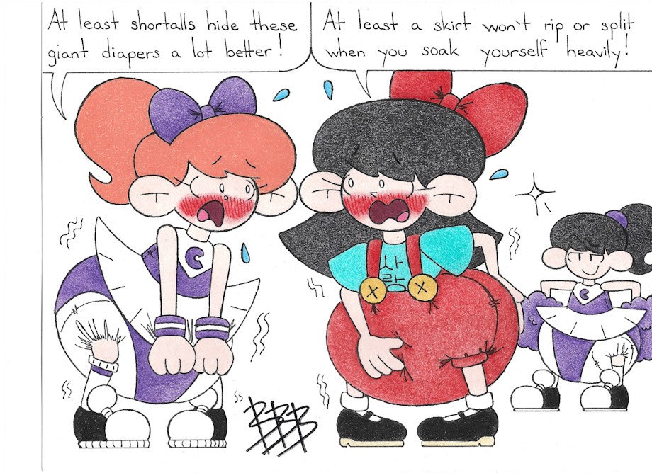 But make it so the skirt draws attention to the diaper and the shortalls have extra padding to make the diaper bigger.
