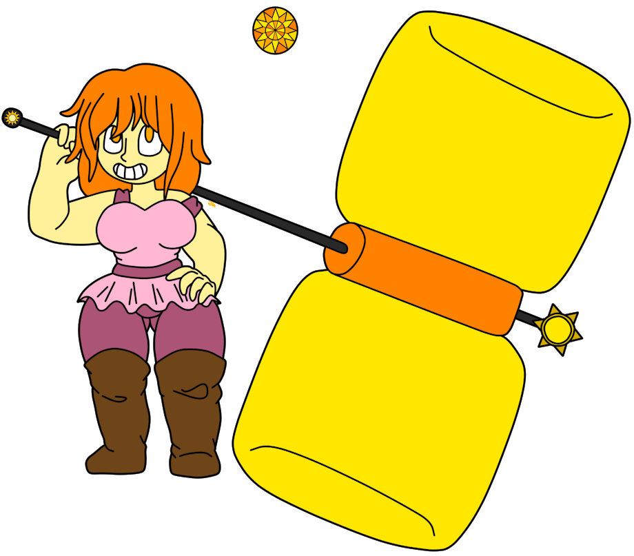 A happy filled diopside made for Pink Diamond. Like Spinel, but was bubbled in Pink's throne room like the Rose Quartz's due to being too much for the Diamonds. She is called Sunny. Her gem is in her right palm and her weapon is a giant war hammer.