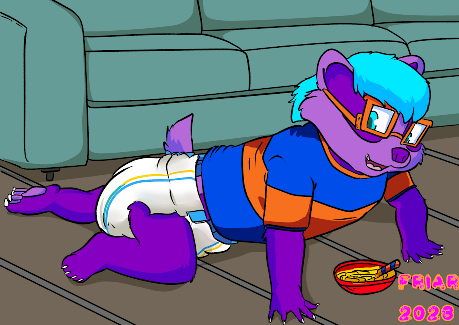 Illustration of Everett facing the camera in a wet and messy diaper flopped on the floor about to eat some mac and cheese.