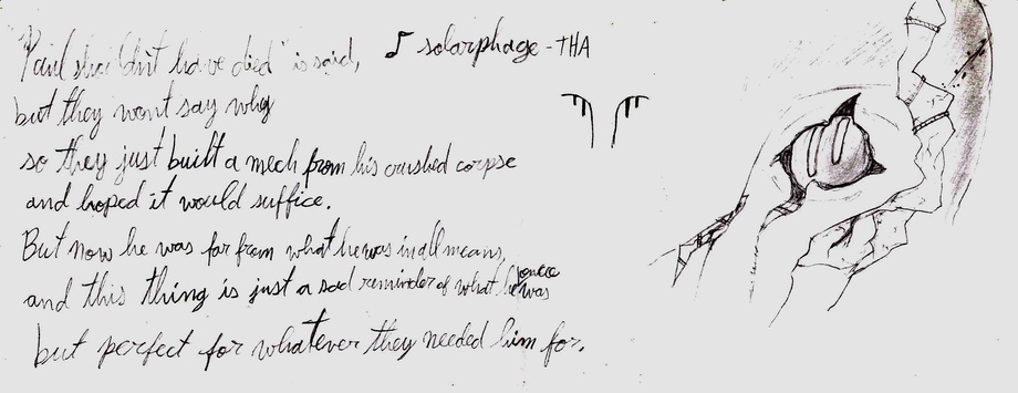 So, On this 4-day-holiday I went to a wedding of someone of my family and had plenty of spare time which I used to relax with music and such. During Solarphage - Hamster Alliance I had one of those "artistical dawns" and my mind saw something amazing... "Paul had died, and he needed to be revived somehow - it happened as a mech, built from his partially rotten corpse" - so I saw machines doing so, like a creepy version of the clip John: rise up (Homestuck), and then he activating the city of steel (Land of Steel and Aphaty), filled with androids. The story ended there, for now. Some other stuff came into mind too, like, as a Mech, he forgot who he was and how to be a person, thus needing to be re-taught.