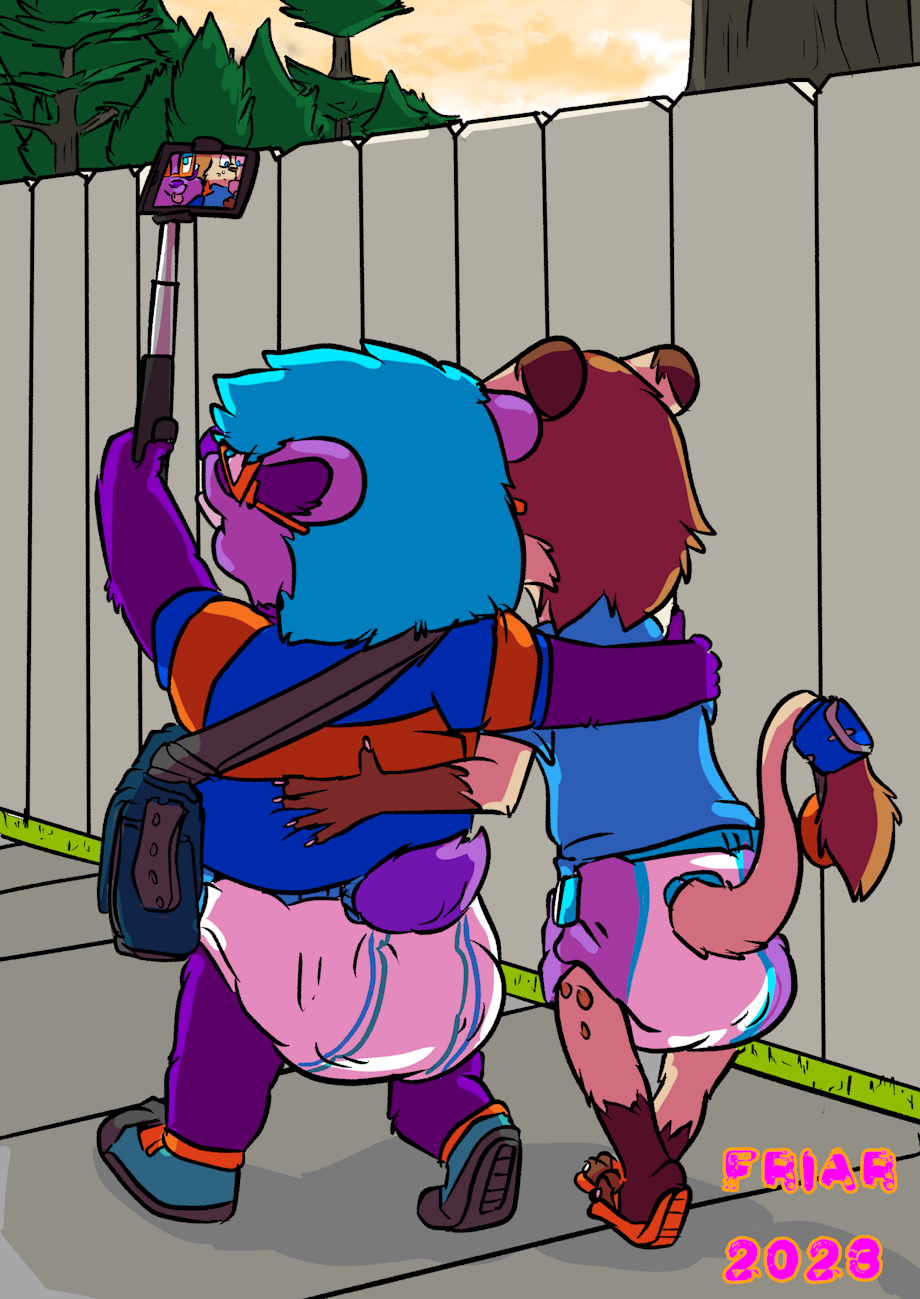Illustration of Everett and Toffee walking home on the sidewalk by Friar's house. Everett is using a selfie stick to take a picture of him and Toffee, and they are in very messy diapers.