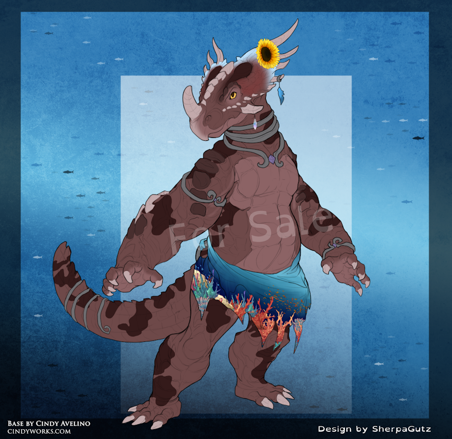 This was a neat one to work with. It's up to you what gender this Styracosaurus is but they're femine in design. The flower and the fish on the skirt are custom Clip Studio Paint brushes! —----------