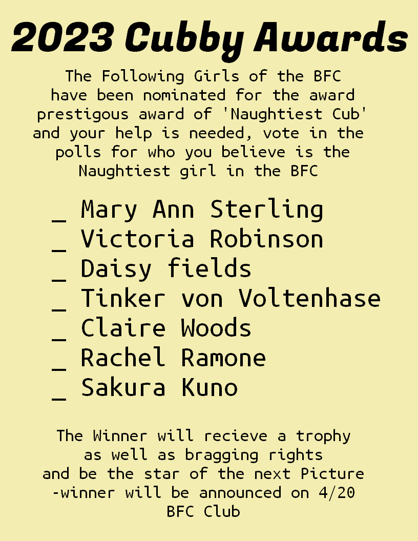 prestigous award of 'Naughtiest Cub' and your help is needed, vote in the polls for who you believe is the Naughtiest girl in the BFC. The Winner will recieve a trophy as well as bragging rights and be the star of the next Picture