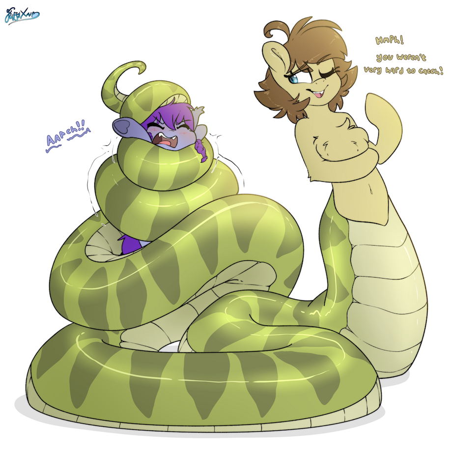 One of my batch of commissions I took featuring Saria. This one also featuring a tiny bat pony known as Amplitude. She's a rather easy fit in this naga's tail.