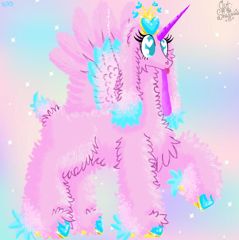 Haha yeah sooo I couldn't really think of her color scheme beyond being like, opposite colors and warm. Now she reminds me of some angelic sunset, and idk it's growing on me. I know she looks a little cracked out but she's just, finally happy. Very happy. And now, she actually gets to rule Equestria...just in a completely different way than she thought and with somepony she loves very much. When she ran away from Starlight, shortly after, she stumbled upon an ultra fluffy pink Earth pony, and immediately, fell head over heels in love with each other. Cupid struck them both that day, and upon spending more time together, Chrysalis gave Fluffle Puff her love and finally was reformed. Chrysalis eventually returns to Ponyville and surrounding areas with her new girlfriend...who once doing the impossible, reforming Chrysalis through her love alone, gained alicorn status. Two ponies undergone their transformations once they both declared their undying love for each other, and Twilight wanting to somewhat retire and teach her friendship lessons all around the globe to every creature, heard of this new alicorn and reforming event, and eventually declared them the new Princesses. Now Princess Chrysalis finds it easy to give love and liking no longer having to hunger, and spending the rest of her life with the love of her life owo