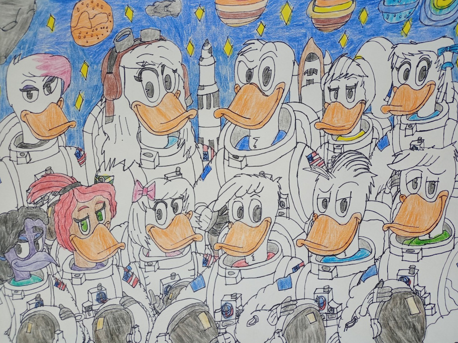 Now this time it's done in space camp. Yes I once again drew a Ducktales team of children and teenagers with mentors Donald and his sister Della Duck who will guide them into space travel experiences and how exciting but extremely dangerous they can be. So maybe one day they all go to space, to a place where there is no end to adventures. Della especially knows what it's like to be there, although she's mostly been to the moon. Yes, they all put on astronaut spacesuits and strike their heroic poses before taking a photo together. I took inspiration from the photos of Dewey Duck posing as an astronaut in a space suit when he did his Dewey Dew-Night when he interviewed his mother in the episode "The Richest Duck in the World". It's a shame there wasn't a chance to get his brothers Huey and Louie photographed in spacesuits as well. Oh yeah, there's already a Marshmello video. XD There may certainly be follow-up adventures after this, since this takes up time after the Ducktales finale ends. Besides Donald and Della who are mentors, there are also Huey, Dewey and Louie, Webby Vanderquack, Gosalyn Mallard, May and June Duck, Lena De Spell (Lena Sabrewing) and Violet Sabrewing. I also wanted to add Phooey Duck and Boyd to my drawing, but unfortunately not all of these characters would fit in one place. Behind them you can see two rockets, one Apollo rocket and the other Space Shuttle, and behind them the background of space with the Moon, Mars, asteroid, Jupiter, Saturn, Uranus and Neptune (heavenly bodies, satellites, asteroids and planets) and one new galaxy and certainly full of stars. Who knows what the future holds for them? Maybe they go on space trips and endless adventures. Who knows. Just so you know that family is the greatest adventure.