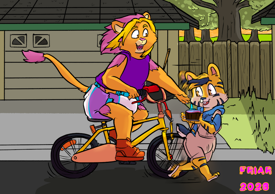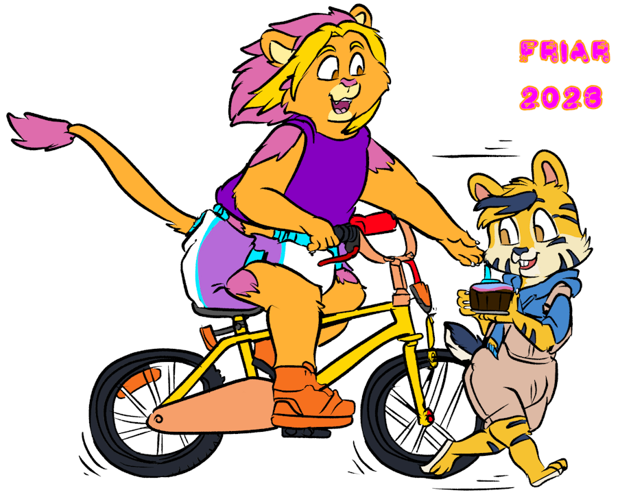 Illustration of Friar on a bike pedaling behind Tavi Munk, handing him a birthday cupcake. Tavi is moving so fast, he's leaving behind a blur. Birthday pic for Tavimunk!