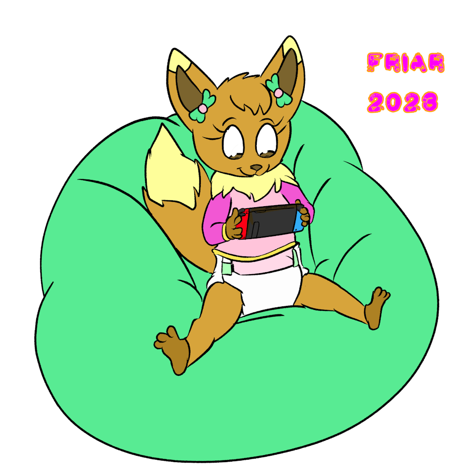 Illustration commission of Fiona Eevee playing Nintendo Switch, looking down at her wet diaper.