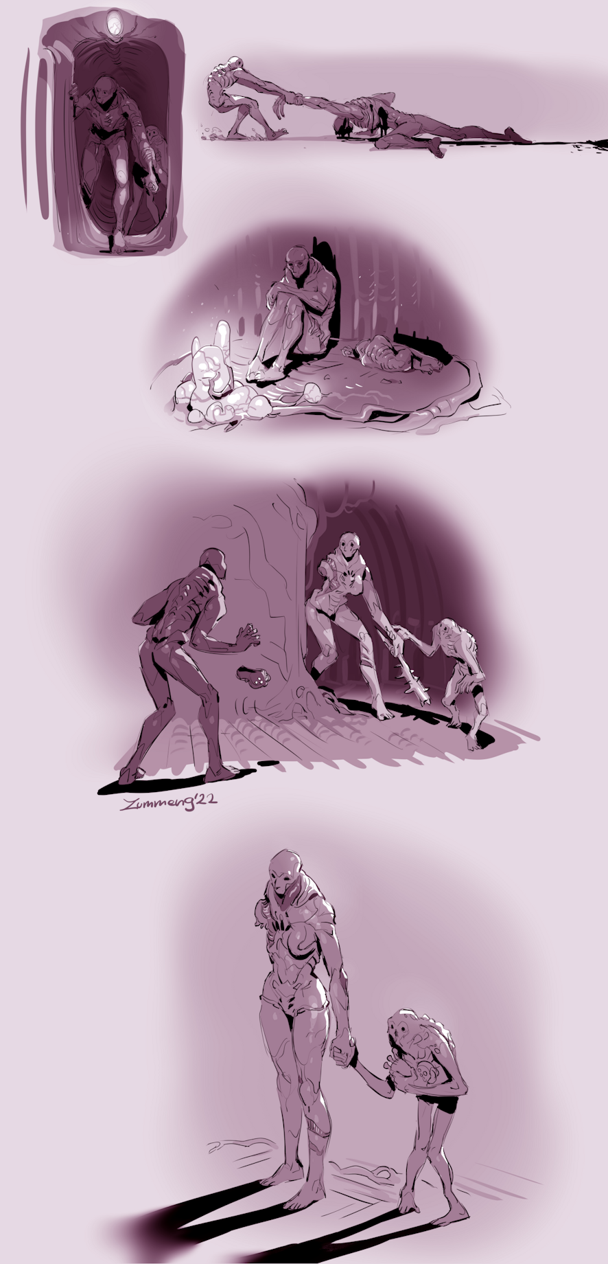 In a nutshell, Scorn is about hopelessness, isolation, and decay. That’s what the lonely main character represents when he starts his journey in a dying world. But I wanted to draw several characters together because, when you meet companions and friends during a difficult journey, things don't seem so hopeless or the horrors are more bearable. I know this is the exact opposite of what the game tries to achieve, but I can't help it; this is how my brain works :D