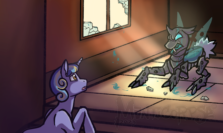 Hoofsteps coming from just below them had awaken them! How long had they been out? Days? Hours? Seconds...? They thought the building was derelict, that no creature would have came to look for them! So the changeling scrambled to their hooves, slipping accidentally on some viscous dark substance they didn't have time to identify, and prepared themselves for the worst! They hissed and backed away when they had seen the silhouette of a pony come up the stairs, a long straight horn coming into view...a unicorn! Oh, they were dead! So dead! They were never going to see their hive again, they were sure of it now!