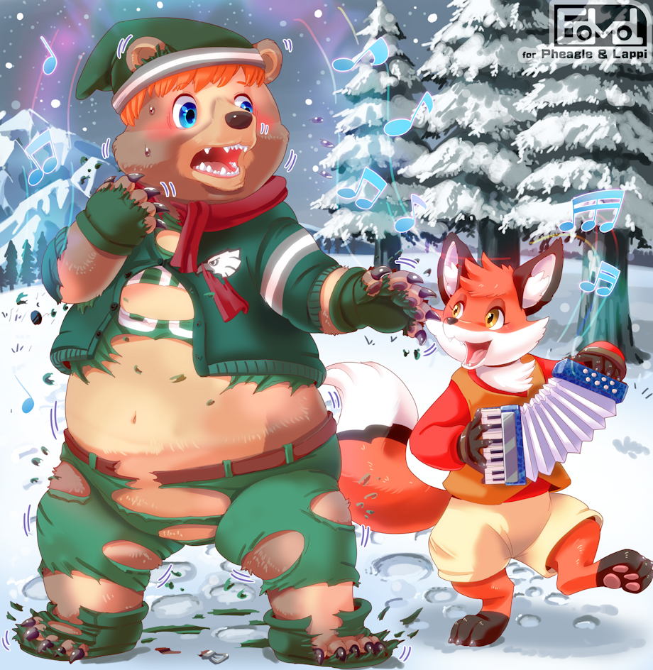 During a rather brisk winter evening, I found myself amid a frigid snowstorm, unable to keep warm even in my thick winter coat, sweatpants, gloves, boots, beanie, and scarf! Luckily, LappiFox arrived quickly to help, but in a rather unorthodox fashion! As he played his accordion and sang to me, I grew out of my winter gear as I transformed into a chubby grizzly! At least now I could bear the cold, but I'd need to buy a whole new outfit!