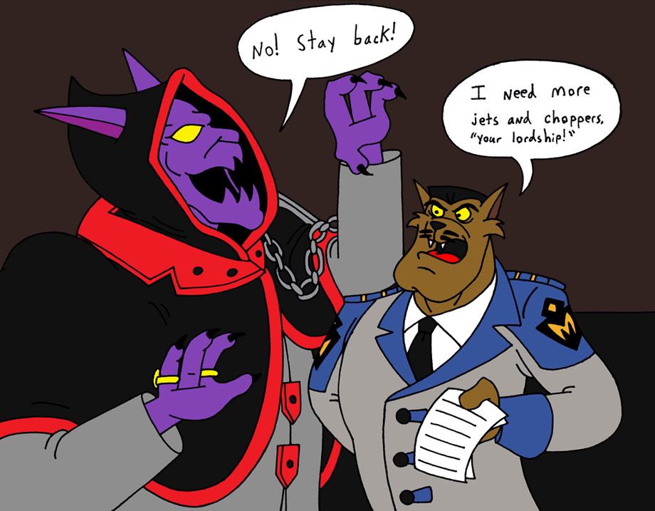 And Mayor Dark Kat's horror continues as Commander Feral is next up to the plate with an order for new Enforcer jets and helicopters. Having already been saddled with the regular mayoral chores, Dark Kat backs away from the Enforcer commander in uncharacteristic horror at the thought of more paperwork.