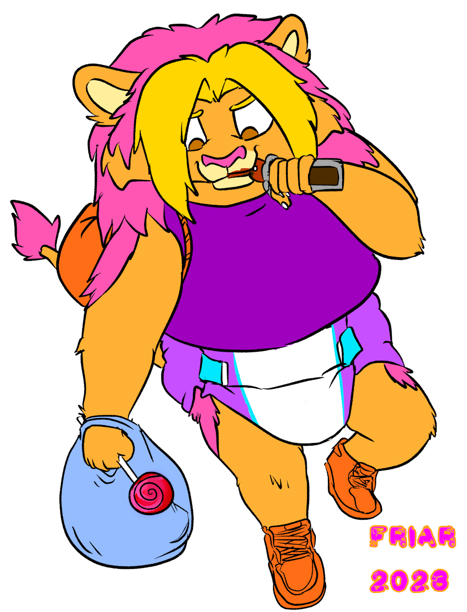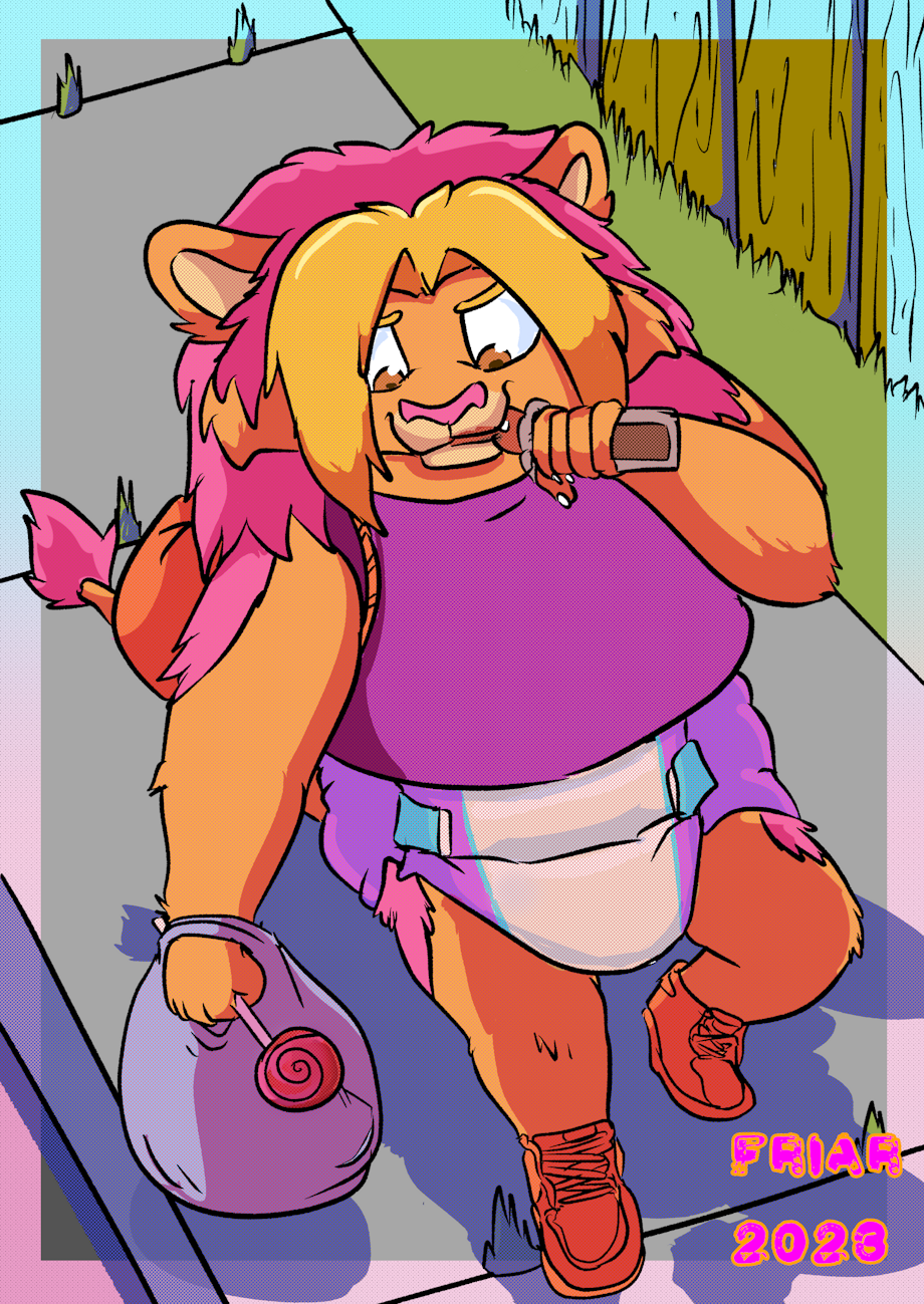 Illustration of Friar from overhead three quarters view of the pink and blonde maned diaper lion wearing his bulky orange basketball high tops walking on the sidewalk holding a large peppermint lollipop and plastic shopping bag with his right hand and his left holding a chocolate bar up to his muzzle, which he is eating. The colors are heavily posterized, revealing a print style filter on the colors. A faded and posterized border frames the image, having a bit of a psychedelic effect.