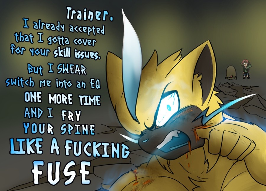 Very true... but hey, at least in this zeraora's case, seems he can at least let out that pent up rage rather freely, definitely not too concerned about having to find new trainers constantly...
