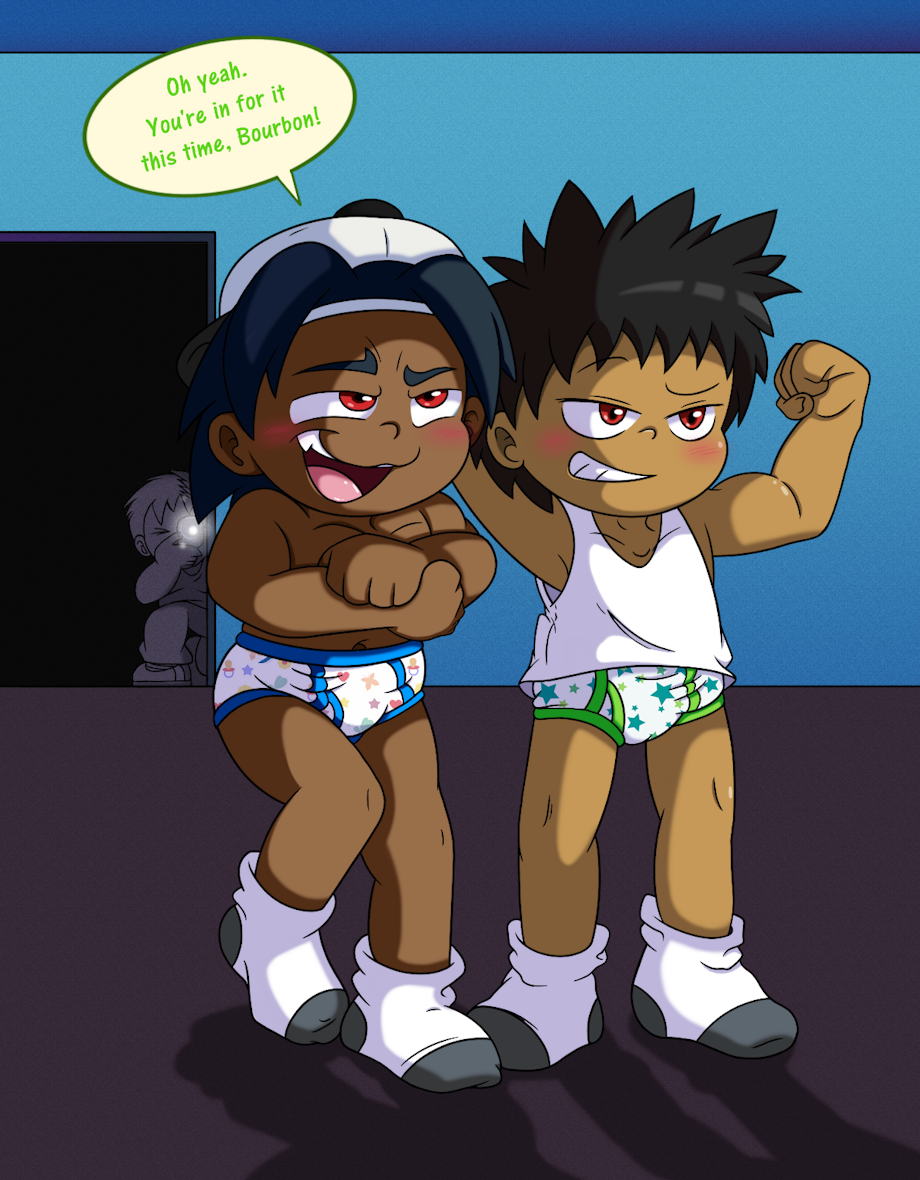 M.C and Jacob pose and flex in front of a mirror to bask in how strong and cool they assuredly look. As Bourbon's rival, M.C especially need to keep in shape for the next time they cross paths. Just don't look behind you and you should be alright as far as confidence goes.