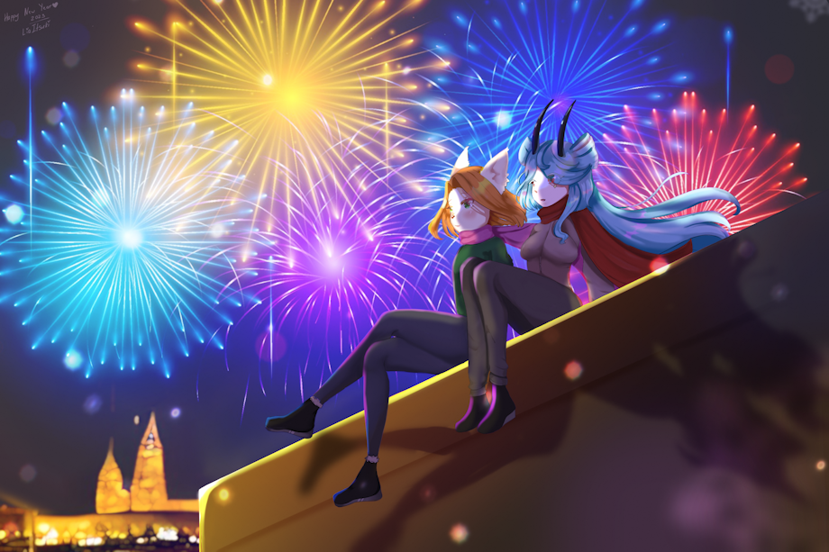 Aurelina and Chikami enjoying a New Year's fireworks show from a convenient rooftop.