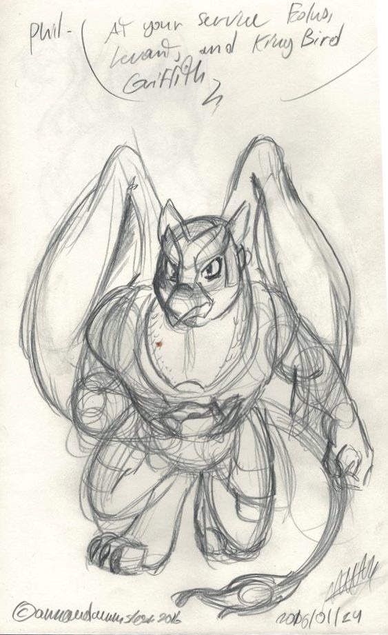 In this scenario I was apparently turned into a griffin and I'm serving royalty. This was drawn 7 years ago for me by