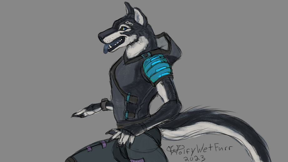 A Wolfy in motion! Leaping, running, or perhaps wading, while dressed in some casual sci-fi attire.
